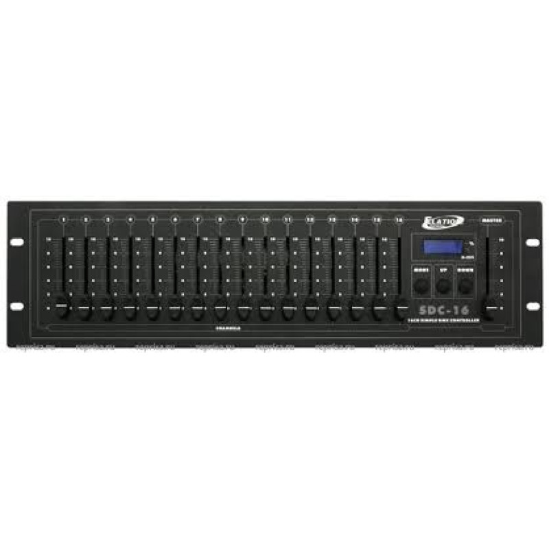 Elation SDC-16 16-канальный DMX-контроллер, 16 фейдеров DMX+1 Master-фейдер Разъем XLR-3 pin, внешний источник питания. Габариты:482х122х80мм(2 U). Вес: 2,3 кг