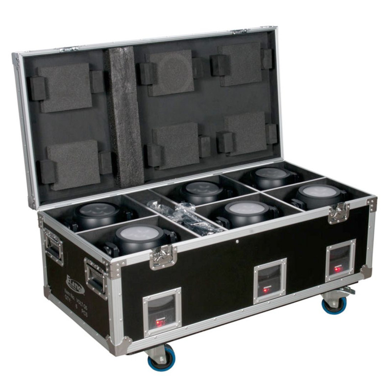 Зарядный Туровый кейс Volt Q5E Six Pack с 6 устройствами Volt Q5E, имеющими категорию защиты IP65, которые идеально подходят для аплайтинга мероприятий или для использования в качестве источников рассеянного света вне помещений; каждое устройство имеет 5 четырехцветных светодиодов RGBW по 10Вт с углом раскрытия луча 9°, для прямого светового потока и 17° для заливки.