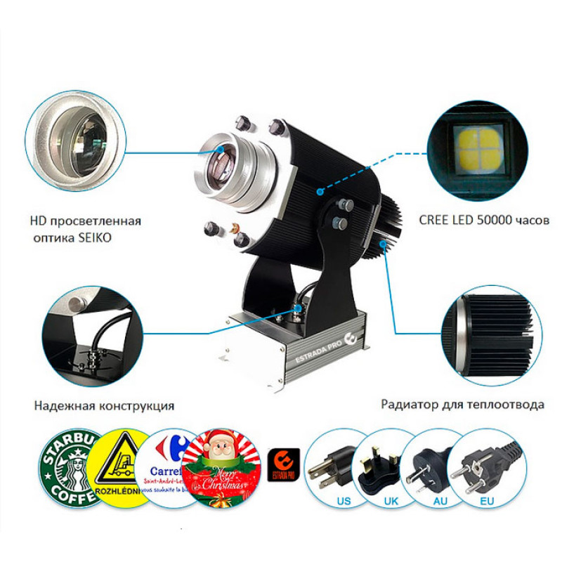 ESTRADA PRO LED GOBO PROJECTOR 30R светодиодный LED гобо проектор для проецирования рекламных изображений, источник света: белый светодиод 30W, температура цвета: 6500K, гобо: 37/27 мм, контроль статика/вращение. LED гобо проектор - необычный и высоко эффективный способ привлечения внимания к вашему бизнесу, идеям, проектам, продуктам и т.д. Предназначен для проецирования текстовых сообщений, изображений, логотипов и т.п. Незаменим в рекламных целях, для проекции текстовых сообщений, изображений, логотипов, фотографий на выставках, в торговых центрах, на свадебных церемониях, вечеринках, при размещении информационных, предупреждающих и навигационных знаков, в конференц-залах, в клубах, ресторанах, кафе, гостиницах, аэропортах, супермаркетах, больницах, метро, в банке, в офисе и мн. др. Данный LED гобо проектор предназначен для использования в основном внутри помещений. При использовании на открытом воздухе рекомендуется разместить проектор под навесом во избежании попадания влаги.