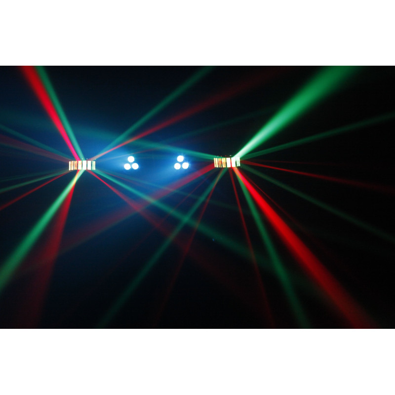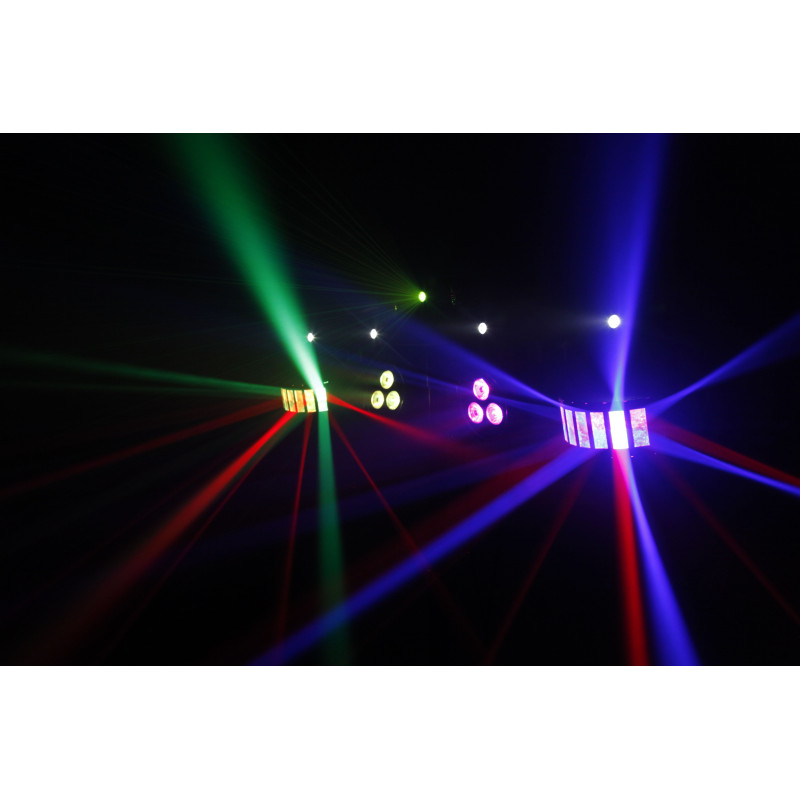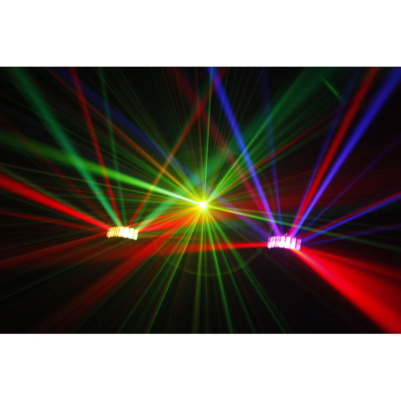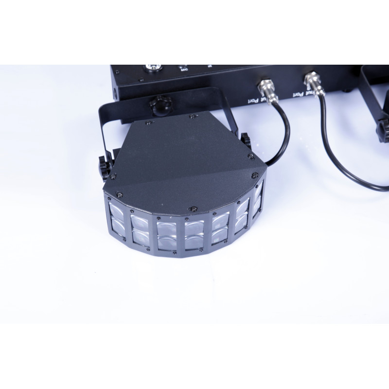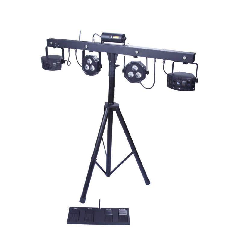 Два дискотечных прибора: 2 x Red 3W, 2 x Green 3W, 2 x Blue 3W. Два прожектора LED PAR: LED 6 х 9W (RGB). Лазер: Green 30mW/532nm, Red 100mW/650nm. Стробоскоп: 4 х LED White 1W. (штатив 1,5-2,5 м, ПДУ, педаль-контроллер, сумка). DMX-512 (3, 5, 9, 27 каналов), звуковая анимация, Auto, Master/Slave