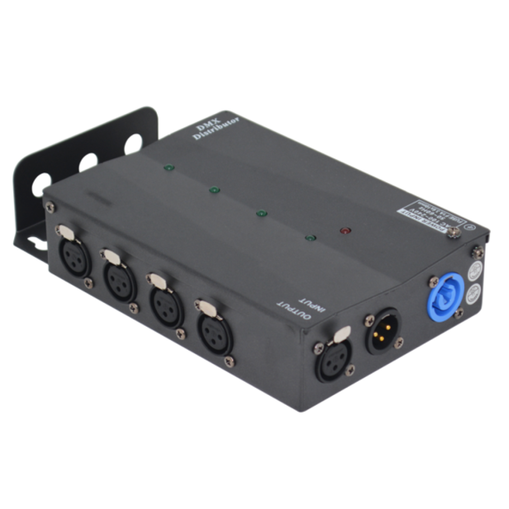 Прибор используется для компенсации потерь сигналов DMX при передаче на большое расстояние. Устройство увеличивает дистанцию передачи. Усилитель оснащен четырьмя распределительными выходами.