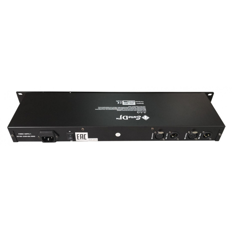 EURO DJ Splitter 1-4U распределительный усилитель (сплиттер) меет универсальный интерфейс, он оснащен сдвоенными разъемами XLR 3Pin и XLR 5Pin как на входе, так и выходе, это упрощает коммутацию в целом.Прибор используется для компенсации потерь сигналов DMX при передаче на большое расстояние. Устройство увеличивает дистанцию передачи. Усилитель оснащен четырьмя распределительными выходами. Между каждым входом и выходом размещен оптически изолированный модуль. Таким образом, порты имеют независимую электрическую изоляцию (без общего заземления). Это обеспечивает безопасную работу высокоточных консолей даже при сбоях оборудования (такого, как модули управления, сканеры, диммеры и т.д.), вызывающих всплеск напряжения в линии. Также устройство позволяет подавать сигналы DMX на различное осветительное оборудование и в целом повышает надежность цифровой системы управления освещением.