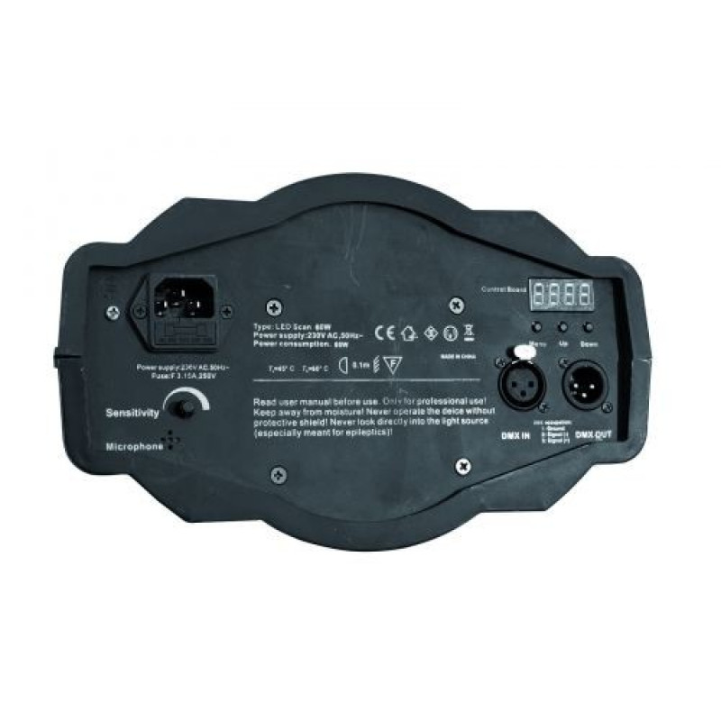 Eurolite LED TSL-400 Scan Сканер светодиодный 60 Вт (аналогичен 300 Вт газоразрядной лампе). Угол раскрытия луча 13°. Ручной фокус. 7 дихроичных цветных фильтров + открытый и 7 вращающихся гобо (трафаретов). Строб эффект с регулируемой скоростью от 1 до 20 вспышек в секунду. Управление: от встроенного микрофона (звуковая активация), режим ведущий/ведомый или по DMX 7 каналов. При отсутствии звукового сигнала работает от встроенных 14 программ. Размеры 550 x 295 x 310 мм, вес 6 кг. Потребляемая мощность 110 Вт.