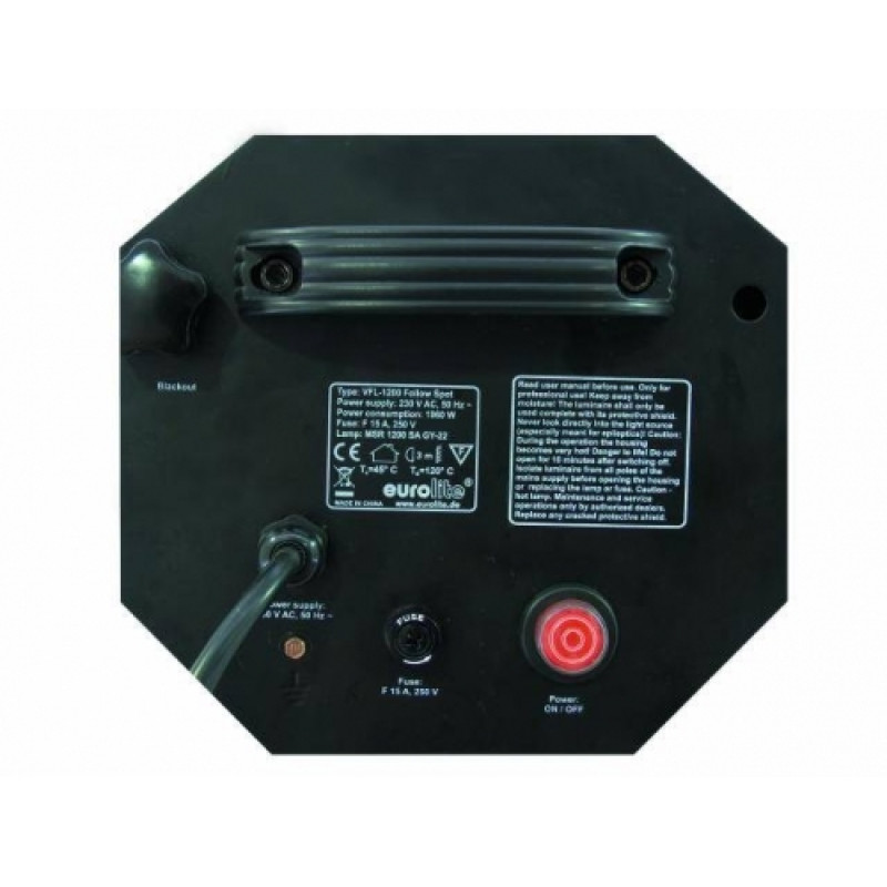 Eurolite VFL-1200 Follow Spot Световая пушка для дальних расстояний 30-40м. Cлот под 66мм гобо. Регулировка ириса. Две вращающиеся линзы для регулировки фокуса и угла. 2 вентиллятора охлаждения. Лампа MSR (HSR)1200 G-22. Питание-AC220В/50 Гц. Потребляемая мощность-1650 Вт. Размеры: 1000 x 250 x 310 мм, вес 33 кг. Тип лампы MSR 1200 (не в комплекте)