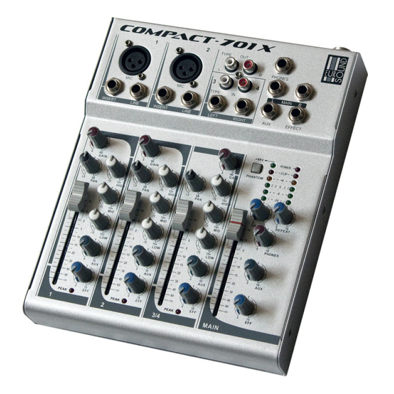 Микшерный пульт, 2 моно, 1 стерео, 3-band EQ, 2 AUX, дилей варьируемый по частоте повторений и громкости, 60-мм фейдеры.