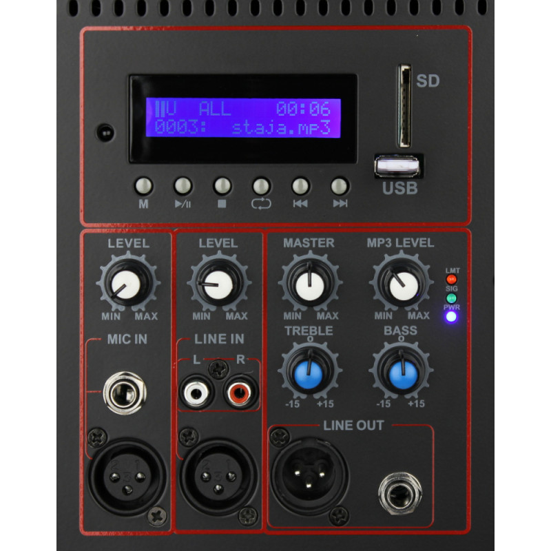Встроенный микшерный пульт имеет один микрофонный вход на разъемах XLR/TRS, предназначенный для подключения шнуровых динамических микрофонов и радиосистем, один линейный вход XLR/RCA, для подачи сигнала с микшерного пульта (XLR) или бытовых CD/DVD-проигрывателей, смартфонов (RCA). Для подключения аналогичной системы имеется линейный выход XLR/TRS. Все входы имеют индивидуальный регулятор громкости.