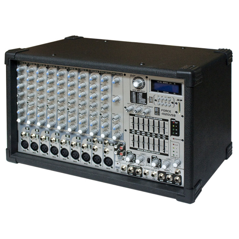 Активный микшерный пульт 2x600 Вт @ 4 Ом, 2x300 Вт @8 Ом, 7 моно, 3 стерео, 9 предусил., МАСТЕР EQ.