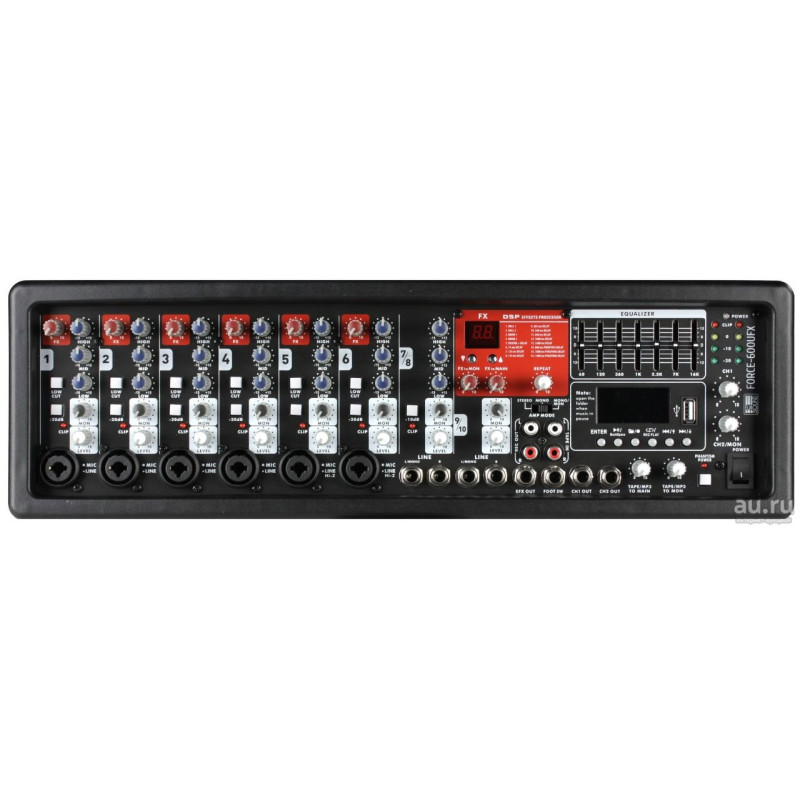 EUROSOUND FORCE-600UFX активный микшерный пульт 2x300 Вт @ 4 Ом, 6 моноканалов (2 из них - Hi-Z), 2 стерео, USB MP3-плеер/рекордер, процессор эффектов, пластиковый корпус.Микшерный пульт со встроенным усилителем мощности, выполненный в пластиковом корпусе, предназначенный для мобильного использования. Пульт имеет 6 микрофонных/линейных входа с комборазъемами XLR/TRS, два из которых (5 и 6) предназначены для подключения гитар/бас-гитар с низким импедансом. Каждый вход имеет 3-полосный эквалайзер, фильтр LOW CUT для удаления нежелательных сверхнизких частот, а также кнопку понижения чувствительности -20 дБ, необходимую для подключения линейных источников сигнала. Также для линейных источников есть две стереопары, одна из которых имеет 3-полосный эквалайзер, другая - нет. Встроенный процессор эффектов имеет 16 пресетов с регулировкой уровня эффекта.Главная "фишка" данной модели - наличие проигрывателя, способного воспроизводить WAV и MP3-файлы, а также поддерживающий русскую кодировку. Помимо этого проигрыватель имеет удобную навигацию по папкам, а также функцию записи микса на флешку.