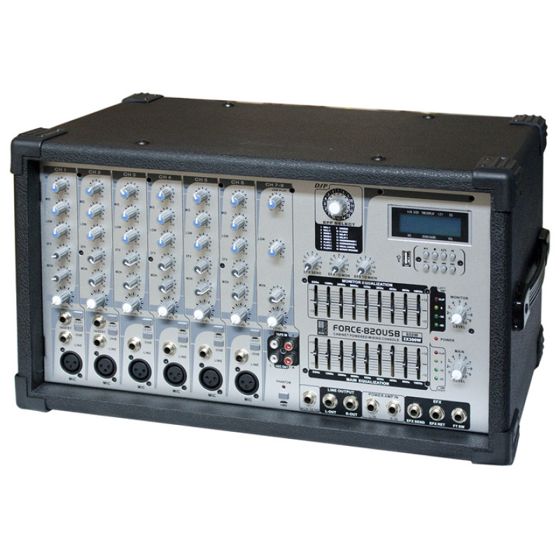 Активный микшерный пульт 2x300 Вт @ 4 Ом, 2x200 Вт @8 Ом, 6 моно, 1 стерео, 6 предусил., МАСТЕР EQ.