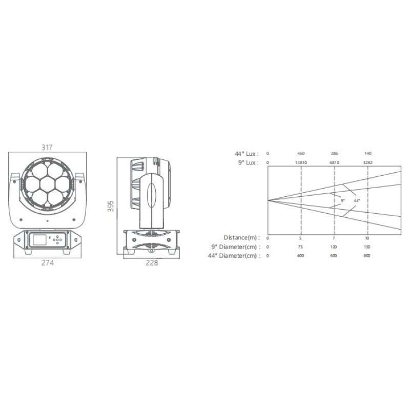 Прожектор имеет зум от 9° до 44°, что позволяет быстро менять угол за 0,8 секунды, создавая разнообразные световые эффекты. Температуру белого можно регулировать в диапазоне от теплого 2800К до холодного 8500К, что дает гибкость в настройке оттенка света.