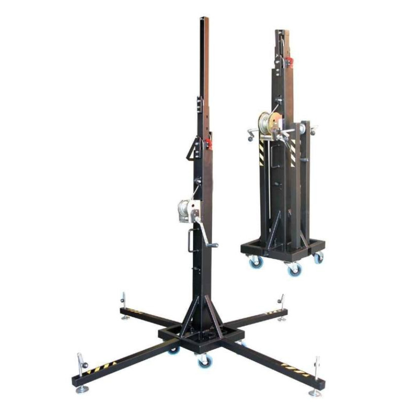 FANTEK T105B телескопический элеватор для установки светового и звукового оборудования, макс. нагрузка 225 кг, регулировка высоты до 5,3 м, замки и лебедка, вес 90 кг, сталь, черный