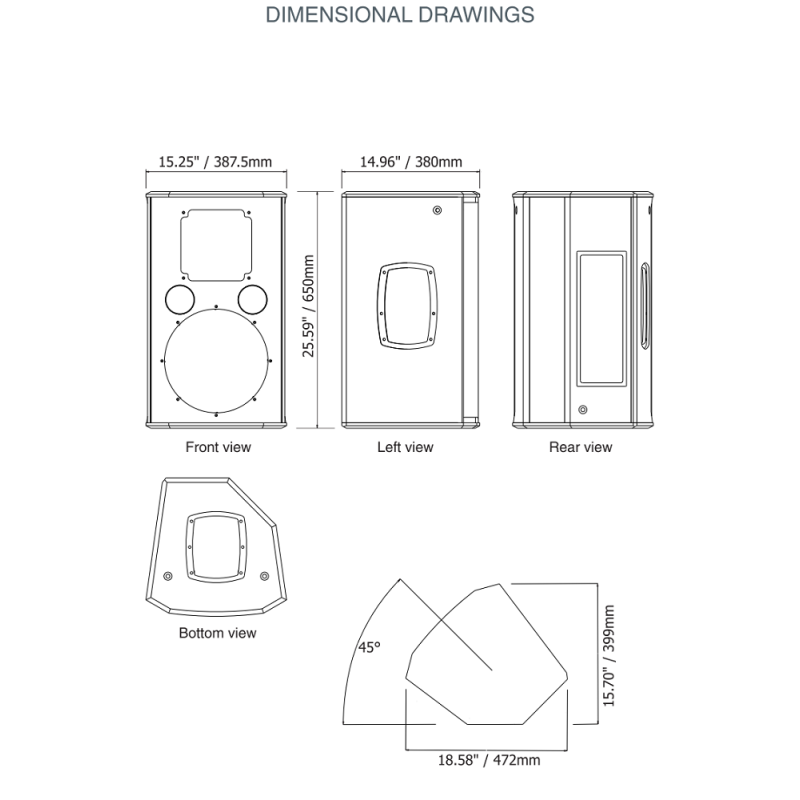 Габаритные размеры 387,5х650х380 мм, вес 20 кг. Монтаж настенный (нужен кронштейн) или напольный, включая положение "на бок" (под углом 45°, сценический монитор). Для переноса предусмотрены ручки. Черный цвет.