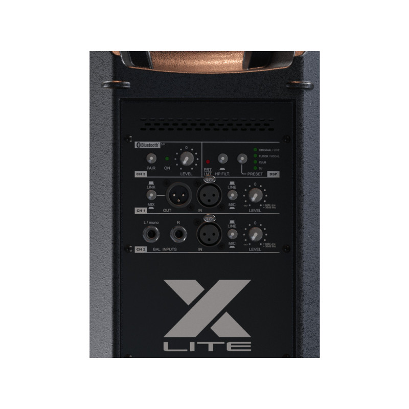 На задней панели расположен трехканальный микшер с двумя входами XLR, стереовход, выход XLR, HP фильтр, селектор DSP пресетов, 4 точки крепления M10 встроенные в корпус, вместе с дополнительными монтажными кронштейнами, позволяют устанавливать акустическую систему на стене или потолке.