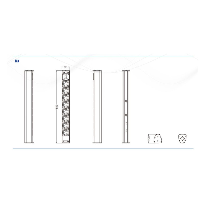 Система может устанавливаться на спикерную стойку 35мм, а также имеет возможность подвеса, что делает K3 универсальным решением для мобильных комплектов и для инсталляций. Благодаря комплектации 1X1" - высокочастотным и 8X3" – среднечастотными неодимовыми динамиками система обладает высокой чувствительностью, чистым и ярким звуком, а корпус из алюминиевого сплава делает её ударопрочной.