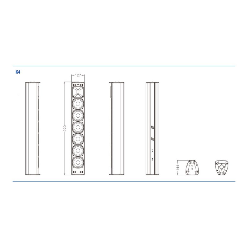 Система может устанавливаться на спикерную стойку 35мм, а также имеет возможность подвеса, что делает K4 универсальным решением для мобильных комплектов и для инсталляций. Благодаря комплектации 1X1.7" - высокочастотным и 6X4" – среднечастотными неодимовыми динамиками система обладает высокой чувствительностью, чистым и ярким звуком, а корпус из алюминиевого сплава делает её ударопрочной.