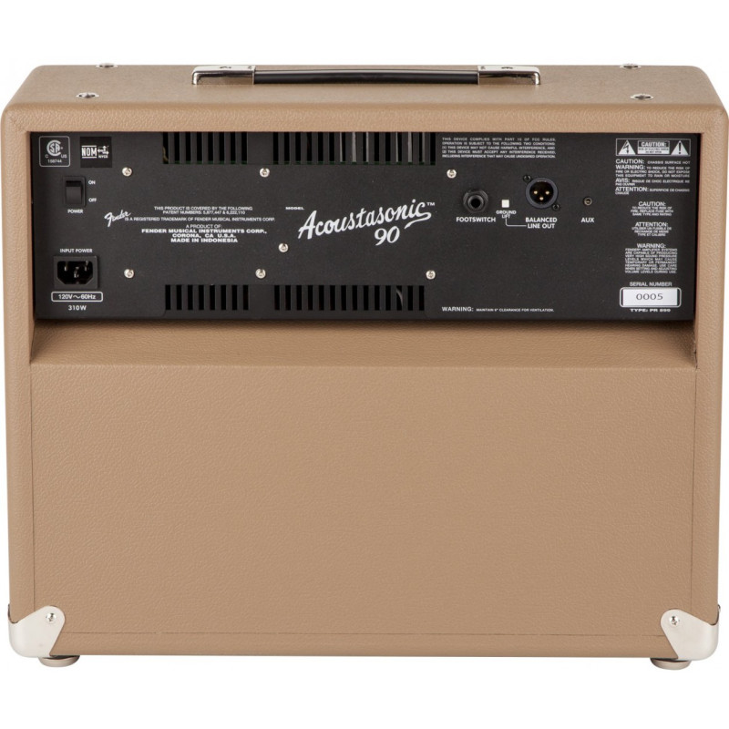 Комбоусилитель оборудован широкополосным динамиком и высокочастотным твитером, общая мощность комбоусилителя составляет 90 Ватт. Для коммутации комбоусилитель предлагает микрофонный и инструментальный каналы, имеющие независимые органы управления, среди которых регуляторы тембра, настройка эффектов, схема подавления обратной и богатая секция эффектов студийного качества. Для каждого из каналов доступна отдельная секция эффектов. Acoustasonic 90 предлагает прекрасное звучание и дизайн от одного из лучших производителей гитарного оборудования, компании Fender.