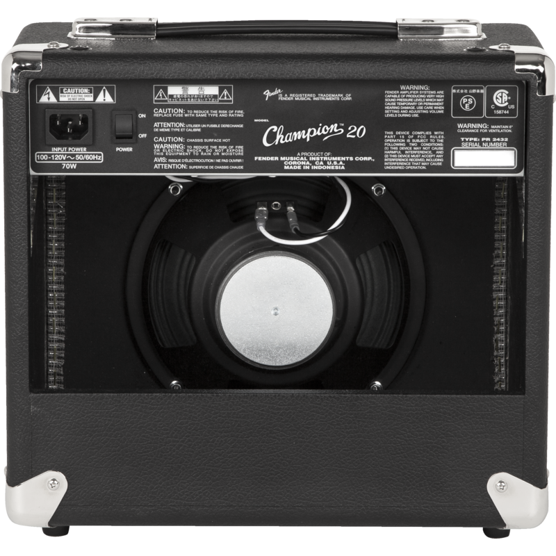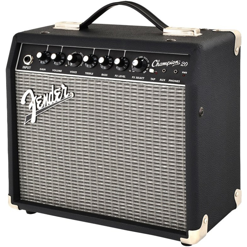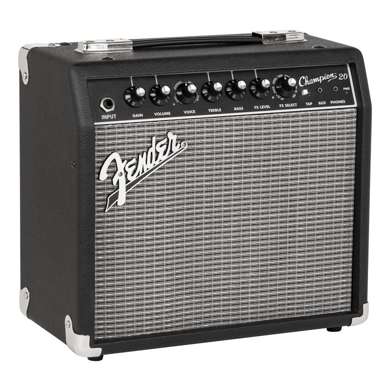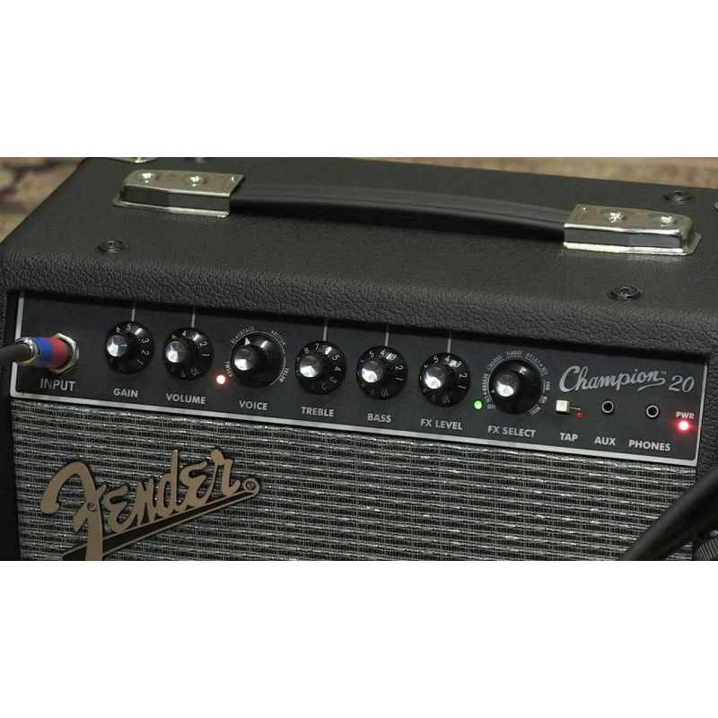 Мощность Fender CHAMPION 20 составляет 20 Вт. Он экипирован одним полнодиапазонным динамиком диаметра 8” и двумя каналами (инструментальным на 1/4" TS Jack и aux на 3,5 мм mini-Jack). У инструментального канала есть собственный регулятор громкости, для него можно применить один из многих бортовых эффектов реверберации, дилэя, эхо, хоруса, тремоло, wah-wah и флэнжер с возможностью регулировки уровня, также есть регулировки двухполосного эквалайзера в виде ручек и выход на наушники на 3,5 мм mini-Jack. Корпус этого прочного и надежного «комбика» выполнен в классическом стиле Fender с черным текстурированным виниловым покрытием и хромированными металлическими деталями.