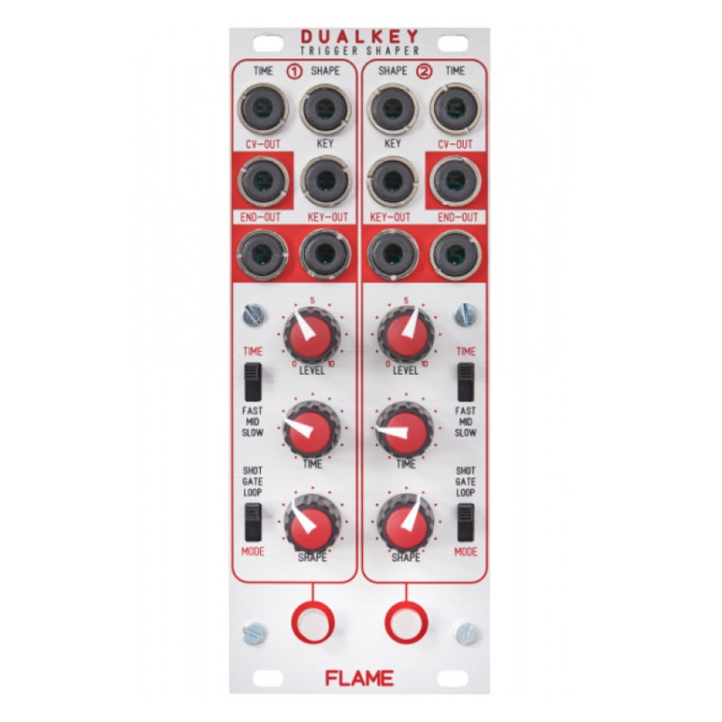 Хотя огибающие Dualkey кажутся одинаковыми, между ними существует важное различие: в то время как модулятор с левой стороны передней панели имеет логарифмический распад и фазу освобождения, правая сторона предлагает линейную характеристику. В противном случае обе схемы идентичны. Каждый модулятор имеет потенциометр для изменения формы огибающей. В деталях, пользователи могут смешать сигналы. Длительность атаки, отпускания и возможная фаза удержания определяется потенциометром Time. Кроме того, есть переключатель времени для выбора между тремя диапазонами управления. (Общий диапазон: от одной миллисекунды до одной минуты). Максимальный выходной уровень огибающей 10 В может быть уменьшен с помощью регулятора уровня. Благодаря входам CV можно модулировать параметры формы и времени. В этом случае потенциометры служат аттенюаторами.