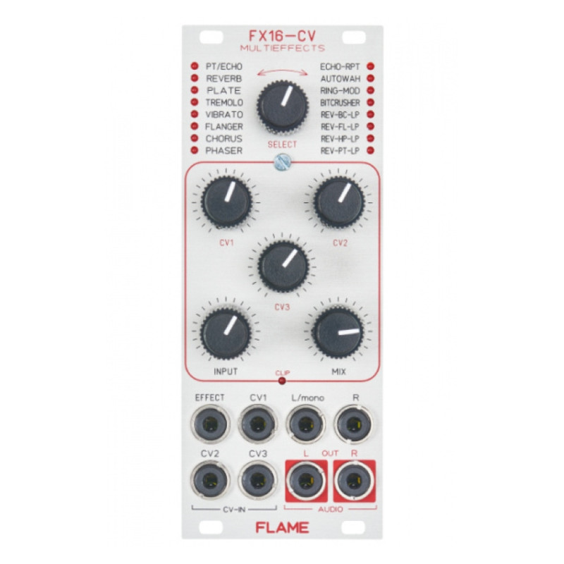 Доступны 16 различных программ мультиэффектов с ручками и дополнительными входами CV для изменения параметров эффекта. Также можно выбрать программу эффектов с помощью CV или банка. Настраиваются уровни стереофонического аудио и стерео выходного уровня. Ввод может быть уменьшен и защищен от пиковых сигналов. Dry / Wet можно использовать для смешивания входного сигнала и сигнала эффекта. Выходы буферизуются с помощью op-amp. Один красный светодиод указывает на клипирование.