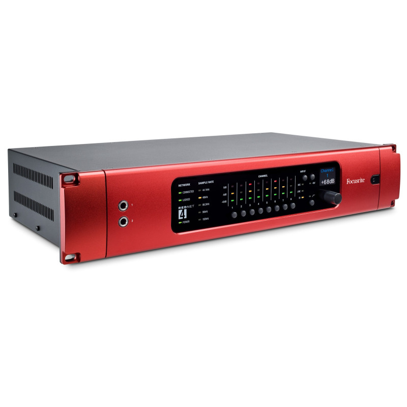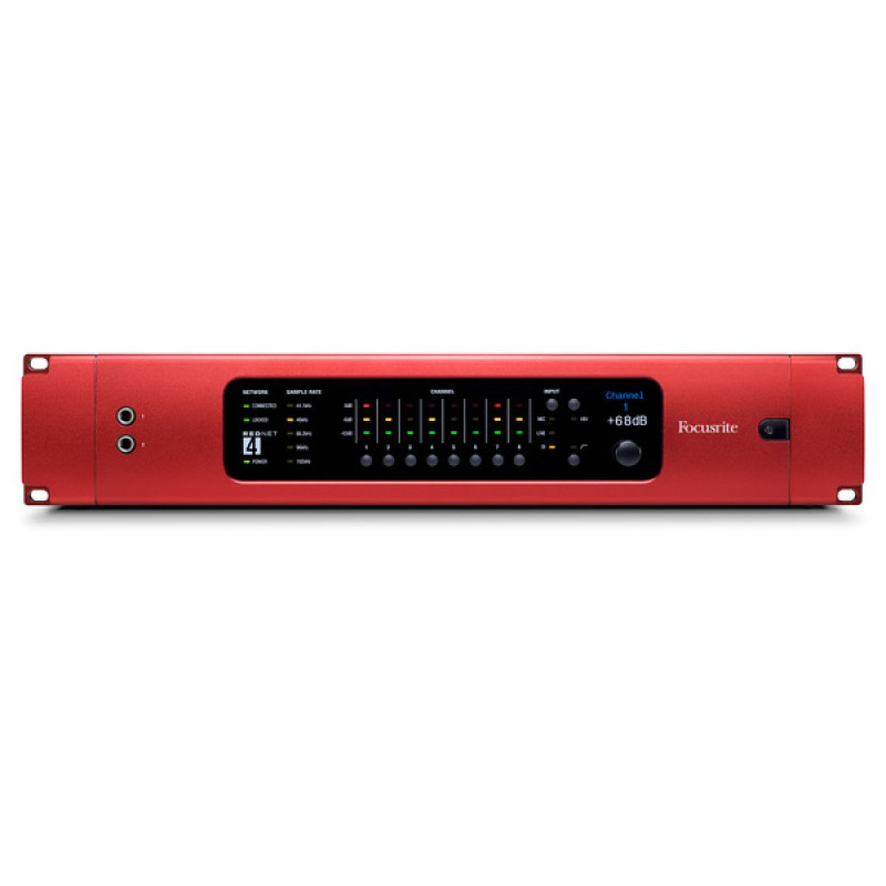 Focusrite RedNet 4 – это студийный рэковый предусилитель класса High End с восемью XLR-входами на тыловой панели с предусилителями для микрофонов и фантомным питанием, восемью аналоговыми (линейными и инструментальными) входами, подключаемыми через отдельный выносной мультикабель D-sub (в комплекте не поставляется) и двумя фронтальными инструментальными входами.