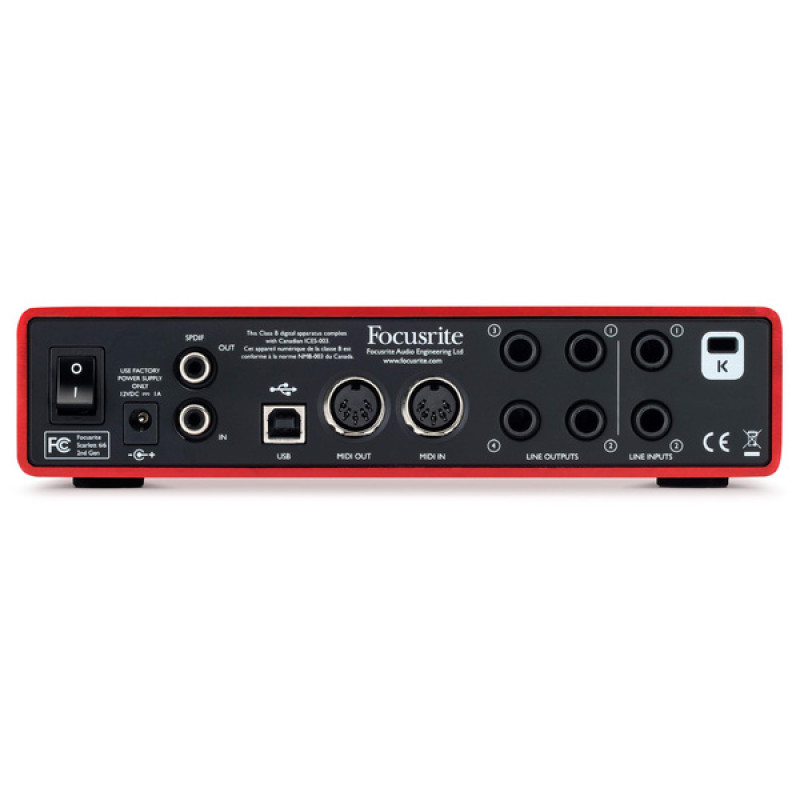 На тыловой части Focusrite Scarlett 6i6 находится USB-разъем типа B для подключения к компьютеру, а также 4 балансных линейных выхода на разъемах 1/4" TRS Jack, два балансных входа на тех же TRS и цифровые вход/выход S/PDIF RCA. Там же можно найти вход и выход MIDI и слот Kensington для защиты. В комплекте с Focusrite Scarlett 6i6 поставляются собственный пакет управления Focusrite Control, DAW Ableton Live Lite и Pro Tools | First, а также набор из 12 плагинов Eleven Lite с эмуляторами гитарного кабинета, пакет Focusrite Red Plug-In Suite, виртуальный инструмент Novation Bass Station Virtual synthesiser и 2 ГБ луп-сэмплов от Loopmasters.