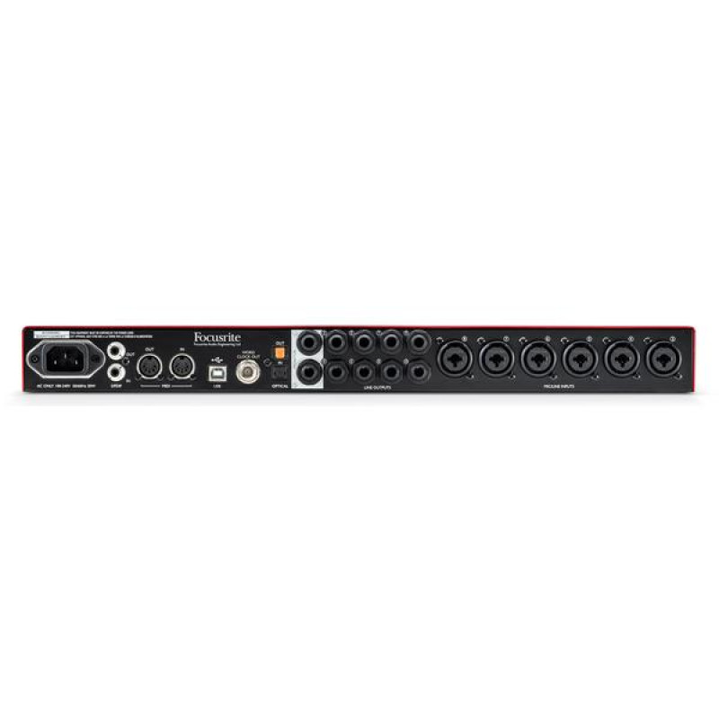 На тыловой части Focusrite Scarlett 18i20 находятся основная масса разъемов. USB-разъем типа B для подключения к компьютеру, 10 балансных линейных выходов на разъемах 1/4" TRS Jack, 6 комбинированных входов на XLR/TRS, цифровые коаксиальные вход/выход S/PDIF RCA и оптические TosLink/ADAT. Там же можно найти вход и выход MIDI, а также BNC-разъем синхронизации Word Clock Out. В комплекте с Focusrite Scarlett 18i20 поставляются собственный пакет управления Focusrite Control (где можно задействовать аппаратный аттенюатор 10 дБ), DAW Ableton Live Lite и Pro Tools | First, а также набор из 12 плагинов Eleven Lite с эмуляторами гитарного кабинета, пакет Focusrite Red Plug-In Suite, виртуальный инструмент Novation Bass Station Virtual synthesiser и 2 ГБ луп-сэмплов от Loopmasters.