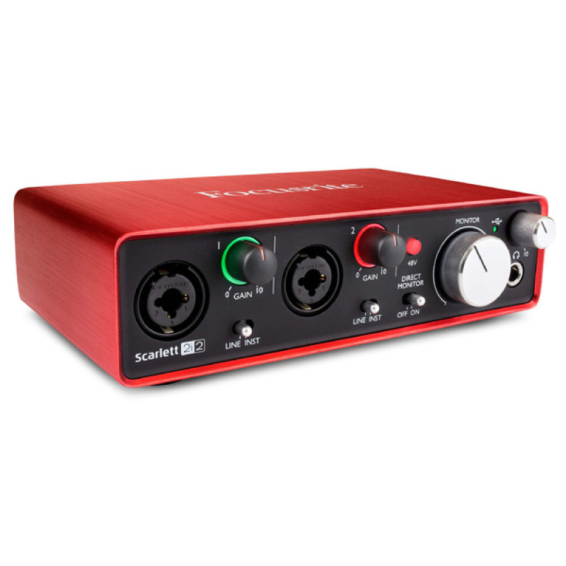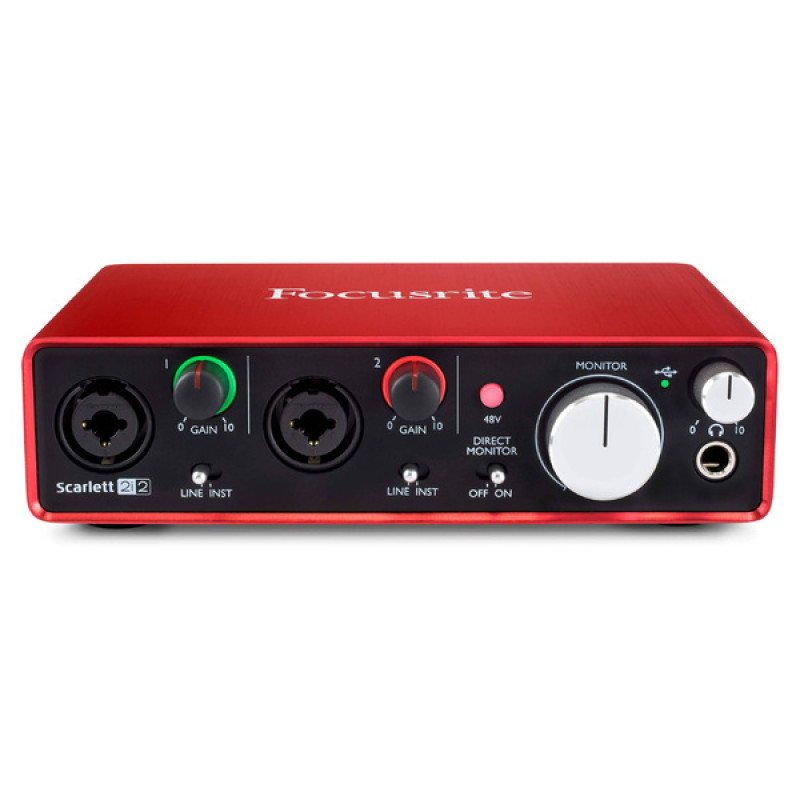 Отличительная черта Focusrite Scarlett 2i2 – микрофонные предусилители с фантомным питанием +48В. Питание включается отдельным переключателем для обоих входов на фронтальной стороне аудиоинтерфейса. Также каждый из двух входов обладает собственным многоцветным светодиодным индикатором, вписанным в регулятор громкости входного сигнала GAIN (расположены рядом с каждым входом). Он показывает как нормальный уровень сигнала, так и клиппирование. На передней панели также можно найти выход на наушники на разъеме 1/4" TRS Jack без аппаратной регулировки и большую ручку прямого мониторинга с нулевой задержкой. Подключение инструментов или линейного источника также регулируется переключателем на фронтальной панели.