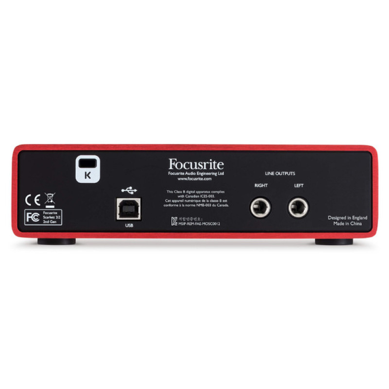 На тыловой части Focusrite Scarlett 2i2 находится слот блокировки Kengsington Lock и USB-разъем типа B для подключения к компьютеру, а также два балансных линейных выхода на разъемах 1/4" TRS Jack. В комплекте с Focusrite Scarlett 2i2 поставляются DAW Ableton Live Lite и Pro Tools | First, а также набор из 12 плагинов Eleven Lite с эмуляторами гитарного кабинета, пакет Focusrite Red Plug-In Suite, виртуальный инструмент Novation Bass Station Virtual synthesiser и 2 ГБ луп-сэмплов от Loopmasters.