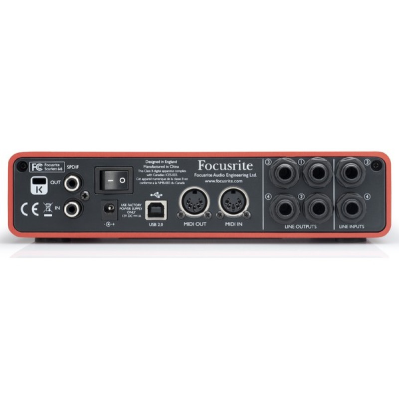 На тыловой части Focusrite Scarlett 6i6 находится слот Kengsington Lock и USB-разъем типа B для подключения к компьютеру, четыре балансных выхода на разъемах 1/4" TRS Jack, а также 2 разъема MIDI in и MIDI out для подключения синтезаторов, MIDI-клавиатур, контроллеров и прочих устройств, поддерживающих данный интерфейс. Есть два выхода на наушники на передней панели на 1/4" TRS Jack с отдельными ручками регулировки, а также большая ручка прямого мониторинга с нулевой задержкой.