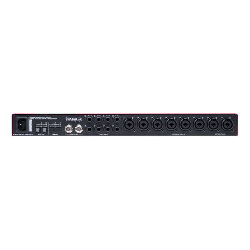 - Это 8 комбинированных микрофонных/линейных входов, два из которых можно использовать в роли инструментальных, восемь линейных выходов, цифровые входы и выходы стандарта ADAT, а также разъемы для синхронизации Word Clock.