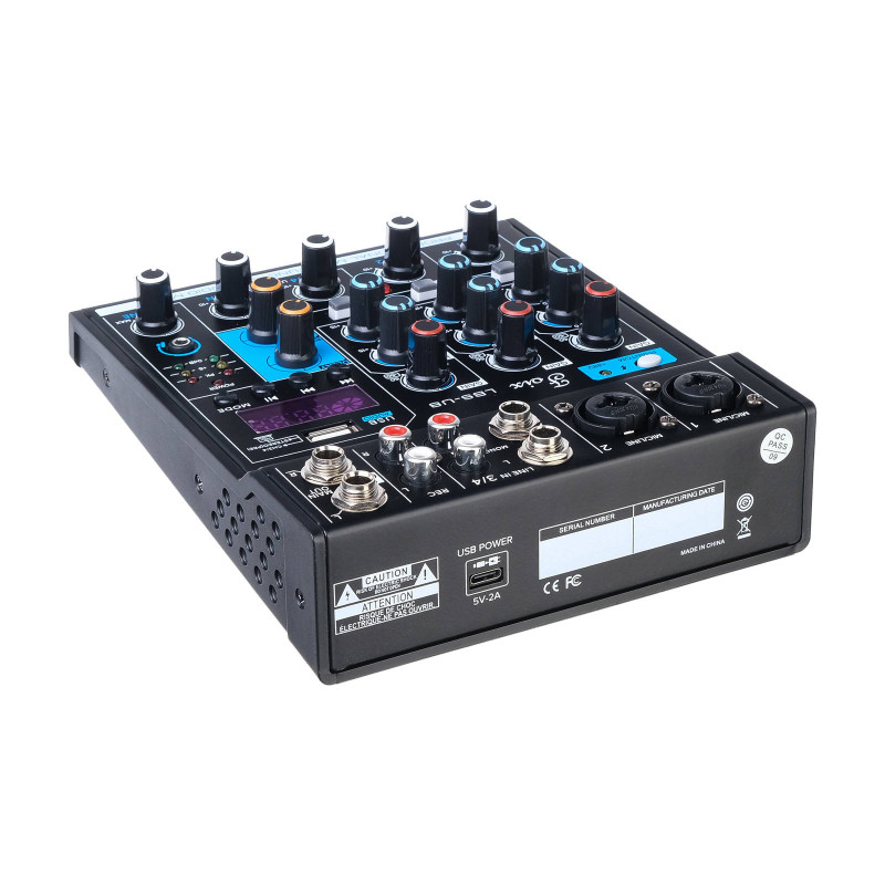 Микшер имеет несколько входов, встроенный фантомный источник питания 48В, гитарный усилитель с высоким импедансом, Bluetooth/MP3-плеер, эффектор и т.д.