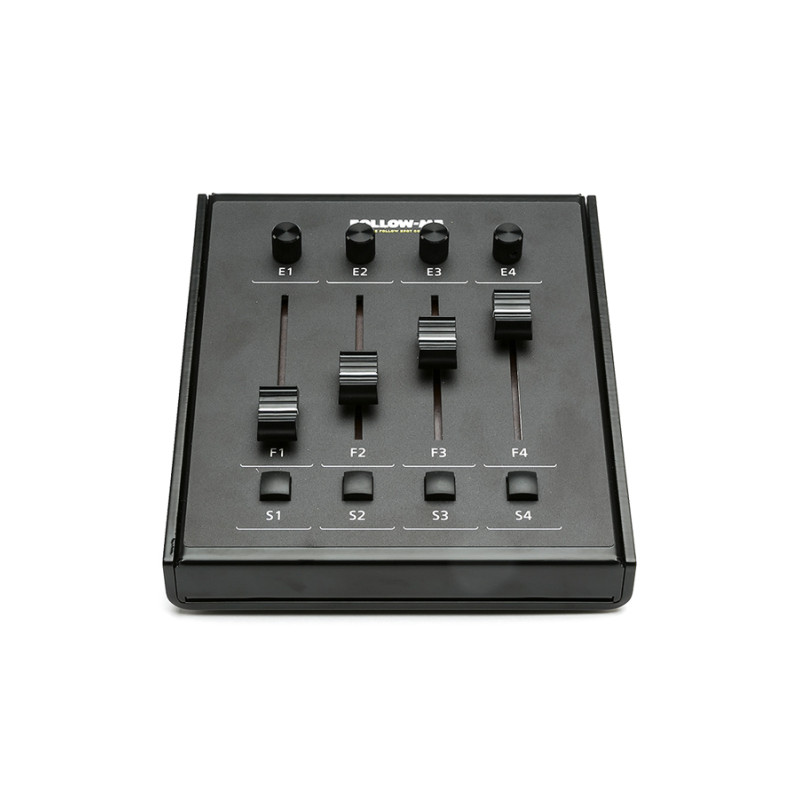 Follow-Me Fader Console Контроллер Follow-Me Fader добавляет дополнительные 4 фейдера, 4 энкодера и 4 клавиши, которые могут быть назначены на любую функцию отображения в программном обеспечении Follow-Me, в том числе управлять экспозицией камеры или Z-коордитатой (смещение по высоте). Эргономичный дизайн, компактный размер.