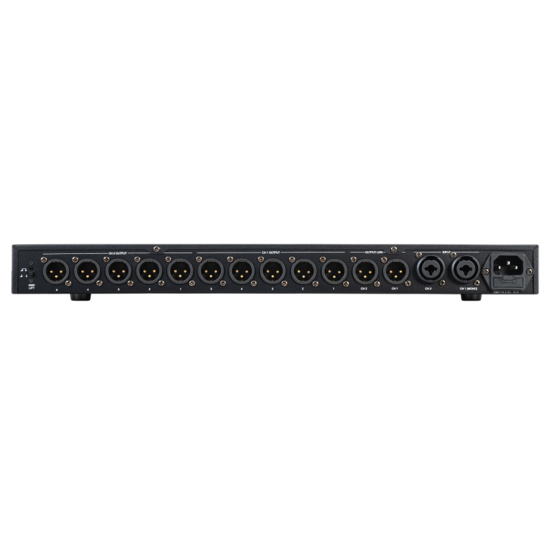 Позволяет преобразовать 1 линейный сигнал в 10 монофонических или 5 стереофонических выходов. Распределяет аудиосигнал на звуковые системы, распределители прессы и т. д. Громкость на каждый выход. Селектор режима работы: моно или стерео. Отключение заземления подъемника GND.