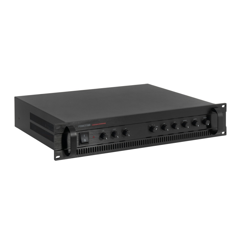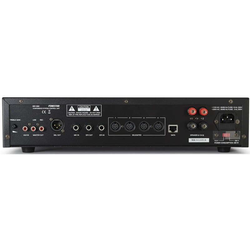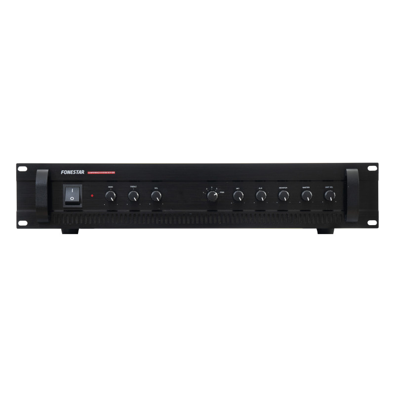 - Центральный блок содержит усилитель с микрофонными входами, линейных выходом и выходом на динамики.