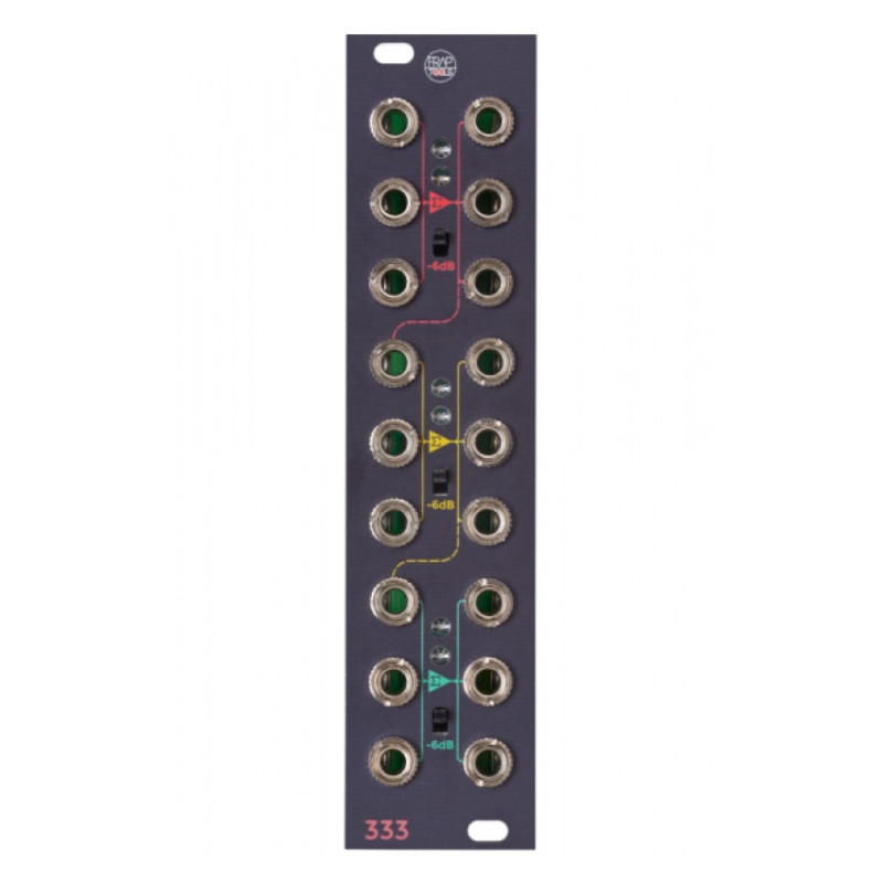 Он содержит три секции с тремя входами и выходами для каждой. Благодаря сумме, связанной с DC, модуль в равной степени подходит для обработки аудиоматериалов, а также для управления напряжениями. Горячие входные сигналы могут быть ослаблены на -6 дБ. Нормализация позволяет пользователям использовать модуль как мультиконнектор с шестью или даже девятью выходами.