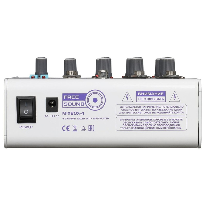 Free Sound Mixbox-4 Серия самых доступных по цене микшерных пультов от FREE SOUND – серия MIXBOX. Удешевление данной серии достигнуто не за счет качества комплектующих, а за счет отказа от некоторых функций, которыми большинство пользователей таких моделей пользуются крайне редко – панорама/баланс, дополнительные выходы (AUX), вход/выход для записи (TAPE IN/REC OUT) и т.д. Но при этом модели данной серии имеют балансные как микрофонные XLR, так и линейные TRS входы с регулятором гейна, 3-полосный эквалайзер на этих входах, а также балансные основные выходы.Модель имеет 2 микрофонных канала и 1 стереопару для линейных источников, выполненную на небалансных разъемах RCA. Для конденсаторных микрофонов имеется фантомное питание, включаемое одновременно для всех микрофонных входов.Также на микрофонных каналах есть простой дилэй процессор с регулировкой времени повтора и громкости эффекта. Ну и наконец MIXBOX-4 имеет встроенный MP3-проигрыватель, читающий файлы с флешек, позволяющий вообще обходиться без внешнего источника сигнала.Данная серия будет очень востребованной прежде всего в бюджетных заведениях: детских садах, школах, сельских ДК, а также в простейших системах фонового озвучивания. Также данные микшерные пульты можно использовать в качестве микрофонных микшерных пультов для подключения настольных микрофонов для конференций.