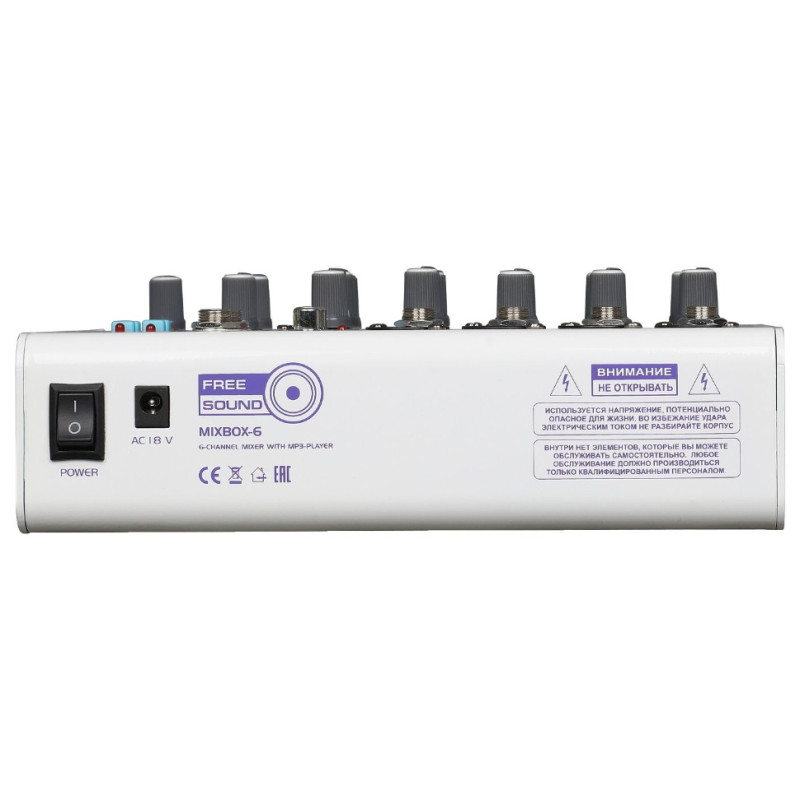 FREE SOUND MIXBOX-6 микшерный пульт. FREE SOUND MIXBOX-6 Серия самых доступных по цене микшерных пультов от FREE SOUND – серия MIXBOX. Удешевление данной серии достигнуто не за счет качества комплектующих, а за счет отказа от некоторых функций, которыми большинство пользователей таких моделей пользуются крайне редко – панорама/баланс, дополнительные выходы (AUX), вход/выход для записи (TAPE IN/REC OUT) и т.д. Но при этом модели данной серии имеют балансные как микрофонные XLR, так и линейные TRS входы с регулятором гейна, 3-полосный эквалайзер на этих входах, а также балансные основные выходы.Модель имеет 4 микрофонных канала и 1 стереопару для линейных источников, выполненную на небалансных разъемах RCA. Для конденсаторных микрофонов имеется фантомное питание, включаемое одновременно для всех микрофонных входов.Также на микрофонных каналах есть простой дилэй процессор с регулировкой времени повтора и громкости эффекта. Ну и наконец MIXBOX-6 имеет встроенный MP3-проигрыватель, читающий файлы с флешек, позволяющий вообще обходиться без внешнего источника сигнала. Данная серия будет очень востребованной прежде всего в бюджетных заведениях: детских садах, школах, сельских ДК, а также в простейших системах фонового озвучивания. Также данные микшерные пульты можно использовать в качестве микрофонных микшерных пультов для подключения настольных микрофонов для конференций.