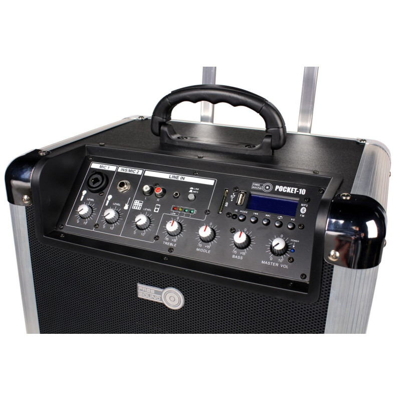 FREE SOUND POCKET-10 Портативная комбо система, 50 Вт, 10" + 1", 1 микр. вход, 1 стереовход, USB/SD/BLUETOOTH MP3-проигрыватель, FM-тюнер, батарея, колеса, выдвигающаяся ручка, вес 16 кг.