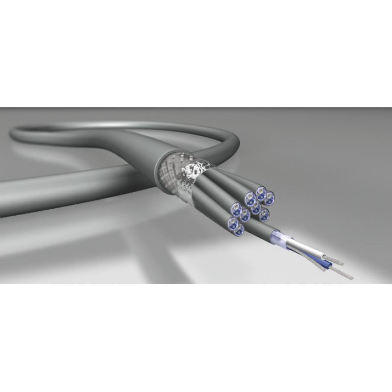 Структура: 6 пар 6х2х0.14 мм2 (2х7*0.16 мм), проводник - витой /голая медь, AWG 26, диэлектрик проводника - вспененный полиэтилен (FPE) с цветовой маркировкой каналов, изоляция пары (FRNC), экран пары - алюминиевый (100%), общий экран - алюминиевый + плетеный из луженой меди (100%+75%), провод заземления из луженой меди, t (-30°C +70°C), диаметр кабеля 13.4 мм, оболочка (FRNC/LSZH-C), стандарт: IEC 60332-3-24, 110 Ом (аналог DRAKA AC10 SS 26/7 6P FRNC-C)