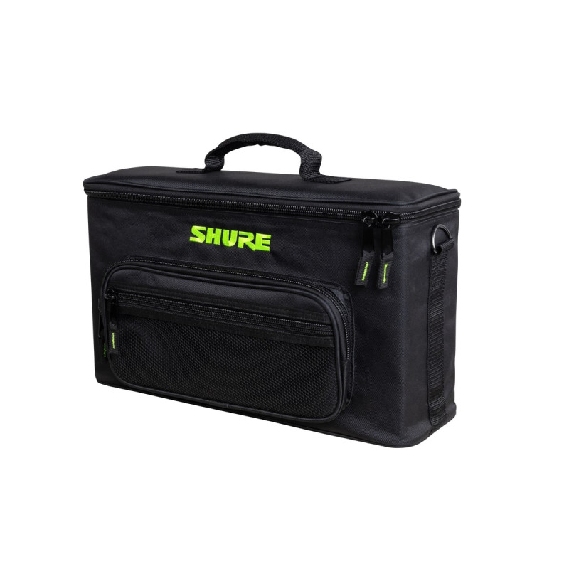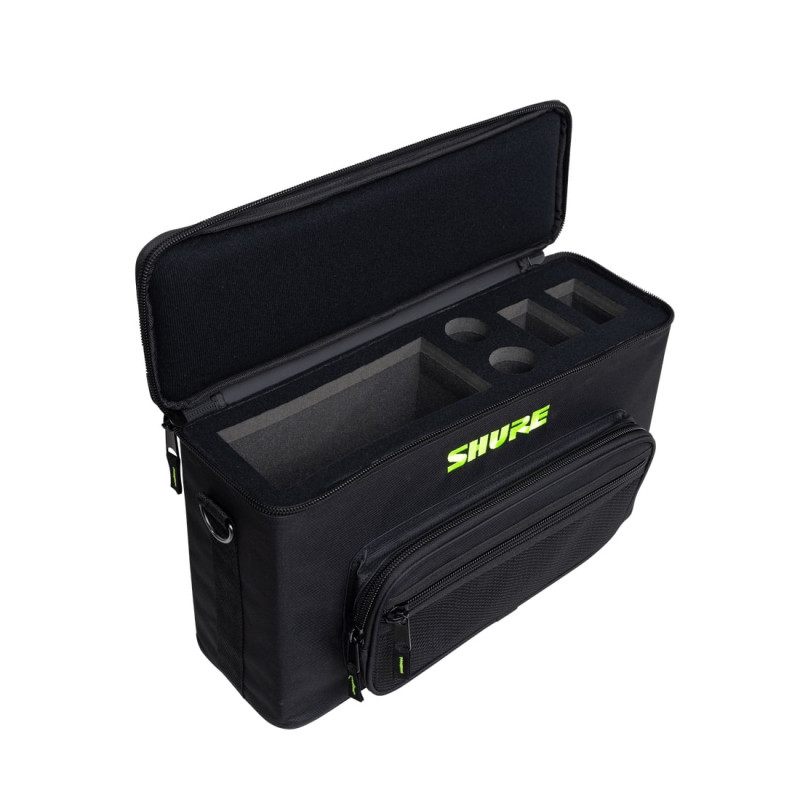 Внутреннее отделение вмещает 2 беспроводных микрофона, 2 приемника и 2 передатчика. Сумка изготовлена из прочного нейлона 600D. Есть внешний карман для кабелей или аксессуаров. Для переноски предусмотрены усиленная мягкая ручка и регулируемый ремень через плечо.