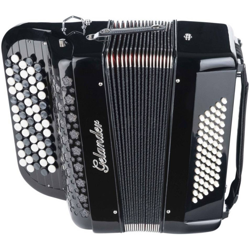 Кнопочный ученический аккордеон GELANDER GH5060B BK черного цвета с готовым аккомпанементом.