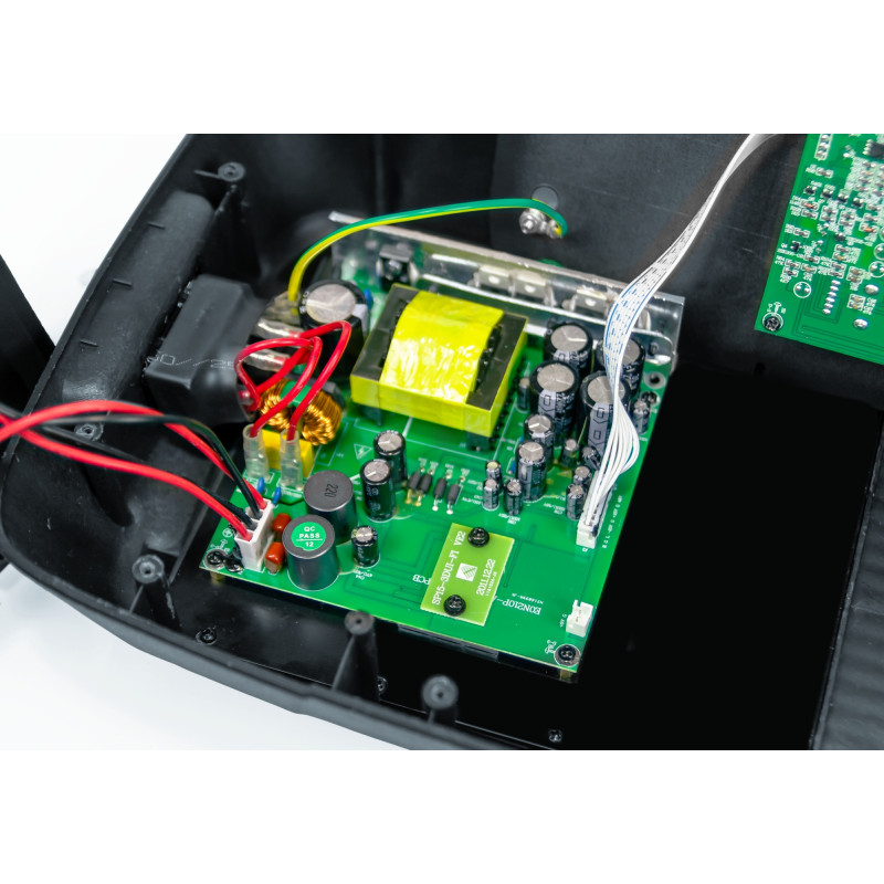 В ES-210MXBL-ST используется пассивная акустика. Весь усилительный тракт располагается в микшере. Для коммутации колонок используются TRS разъемы. Это существенно облегчает подключение и позволяет при необходимости купить провода более подходящей длины. Разъем для подключения на колонках находится сзади в нижней части корпуса. В микшере разъемы расположены сбоку и для удобства подписаны.