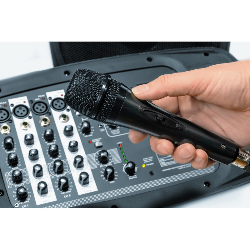 Все необходимые провода для подключения уже идут в комплекте. Предусмотрен микрофонный кабель, провода для колонок и кабель питания. Длина проводов, соединяющих микшер с колонками составляет 7 метров, провод для микрофона 5 метровый.