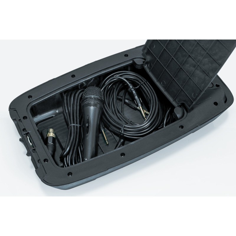 В одном из таких отсеков расположен микшер, в другом - футляр для хранения проводов и различных аксессуаров. В верхней части корпуса предусмотрена ручка для переноски.