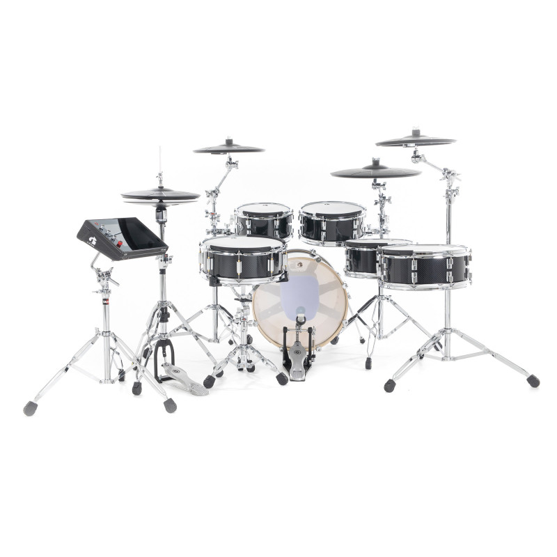 - Пэды тарелок: два 14” Crash (3 зоны), 18 дюймов Ride (3 зоны), Hi-Hat 14 дюймов (3 зоны) + контроллер хай-хэта со стойкой хай-хэта