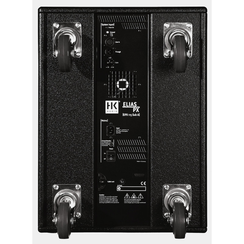 HK Audio ELIAS EPX 115A активный сабвуфер. ELIAS PX Sub A сабвуфер оснащен 15" динамиком прямого излучения. Интегрированные электронные схемы и 400-ваттный усилитель обеспечивают чистое, мощное басовое звучание. Колонку легко перемещать на 100 мм колесах, таким образом, сабвуфер EPX 115 Sub A можно использовать и как транспортировочную тележку для СЧ/ВЧ кабинетов. Колонка имеет сбалансированный центр тяжести - никакого дёрганья, наклона или непроизвольного поворота во время функционирования. Основания сабвуферов на заводе оснащаются 100 мм колесами для удобства транспортировки.