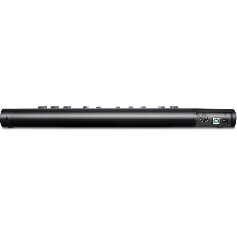 В наличии есть 25 уменьшенных клавиш, оснащенных чувствительностью к силе нажатия. Такой формат клавиш будет удобен для работы с виртуальными музыкальными инструментами типа Lead или Bass, аппликатура которых проста и обычно состоит из последовательности отдельных нот, а не больших аккордов. Для управления функционалом есть пять кнопок: они отвечают за смену октав, транспортирование, включение режима арпеджиатора и за функцию сустейна. Наконец, здесь есть джойстик, который одновременно отвечает за высоту тона и глубину модуляции, но может быть назначен и на любые другие параметры.
