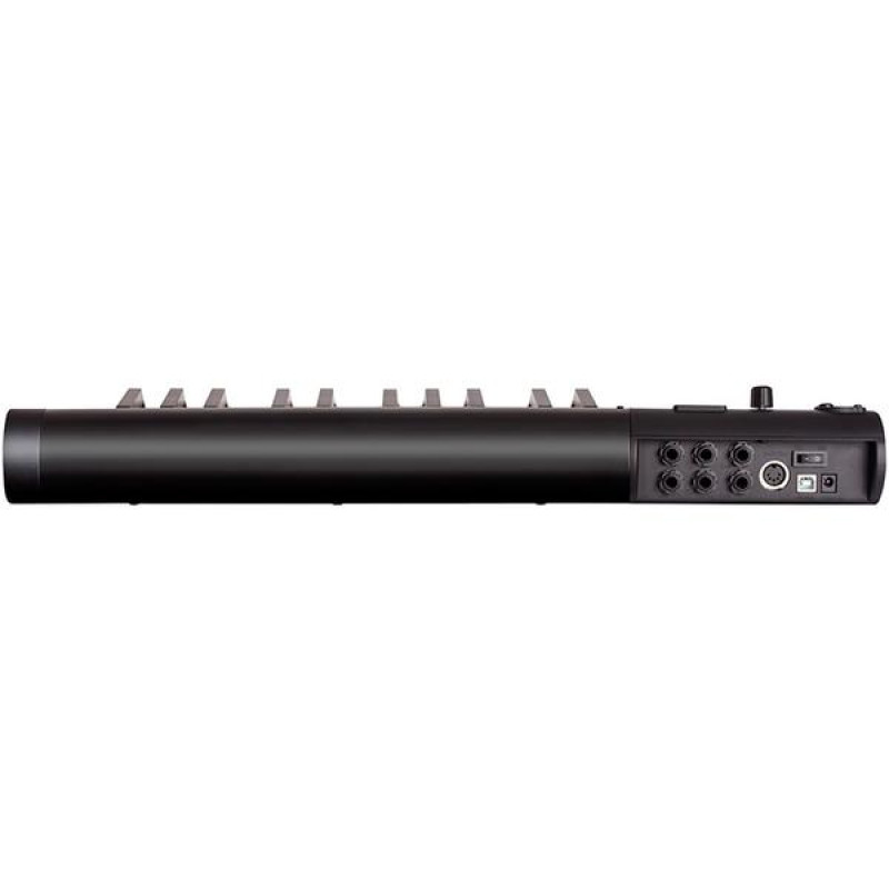 Модель оборудована 25-клавишной полувзвешенной полноразмерной клавиатурой, которая обладает чувствительностью к силе нажатия. Рядом с ними располагаются все органы управления, представленные 22 кнопками с подсветкой, 2 колесами, 2 регуляторами, сенсорной полосой для эффектов и многофункциональным энкодером, которые оборудованы сегментной индикацией. С помощью них можно управлять высотой тона и глубиной модуляции, менять октавы и тональность, осуществлять навигацию по DAW, управлять процессом записи и многое другое. Наконец, кнопка для выключения прибора находится на панели коммутации.
