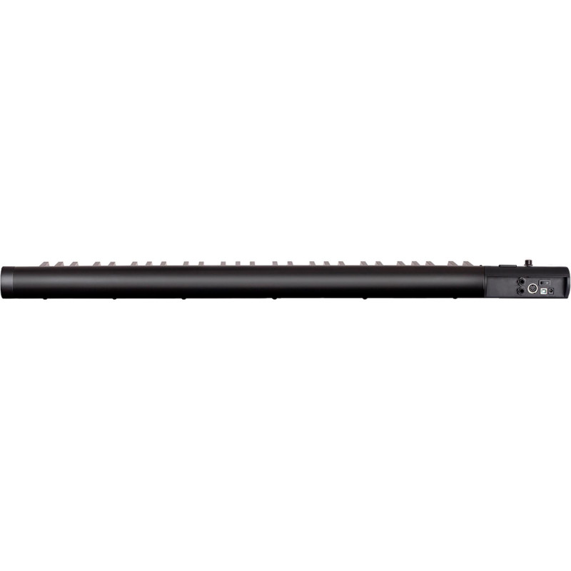 Клавиатура фортепианного типа имеет 61 полноразмерную клавишу с чувствительностью к силе нажатия. Такое количество клавиш позволяет комфортно исполнять сложные академические произведения с широкой динамикой. Уже упомянутая панель включает в себя 23 кнопки, 2 колеса для изменения высоты тона и интенсивности модуляции, назначаемую сенсорную полосу, а также энкодер. Все органы управления имеют либо встроенную подсветку, либо сегментную светодиодную индикацию. Для отображения значений изменяемых параметров есть ЖК-дисплей. Наконец, на задней части корпуса располагается удобный выключатель.