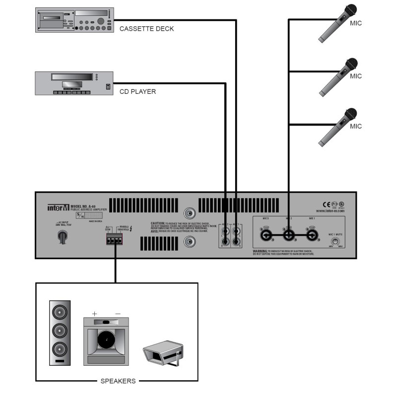 Конструкцией учтена возможность подключения к универсальным выходам всевозможных источников сигналов, например CD/MP3-проигрыватели, тюнеры, ПК. Для подключения микрофонов установлены отдельные входы MIC1–MIC3, при этом MIC1 является приоритетным. При постулении на него сигнала остальные сигналы приглушаются, уровень приглушения устанавливается регулятором MIC1 MUTE. Также присутствуют разъемы для подключения трансляционных громкоговорителей 70В или 100В и акустических систем c общим сопротивлением 4 Ом. Питание – от сети ~220В 50Гц. Устанавливается блок самостоятельно либо с помощью доп. креплений BKT-A120 в 19-дюймовую стойку.